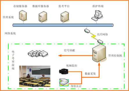 電子考場(chǎng)是利用電子信息技術(shù)、計算機技術(shù)、網(wǎng)絡(luò )技術(shù)對考試進(jìn)行輔助監管和考試人員身份識別的信息管理系統,將考場(chǎng)的信息傳送到監考中心存檔管理。電子考場(chǎng)前端采用攝像機、身份證識別機等設備進(jìn)行驗證和數據采集,通過(guò)網(wǎng)絡(luò )傳輸到后端監考管理中心,后端監考中心對不同的使用人員賦予不同的權限,對前端考場(chǎng)考生信息、考試情況、監考教師情況進(jìn)行檢查和監督。當考情發(fā)生異常情況時(shí),系統進(jìn)行報警,并抓拍當時(shí)圖片,進(jìn)行語(yǔ)音提示,對后續處理工作提供依據。